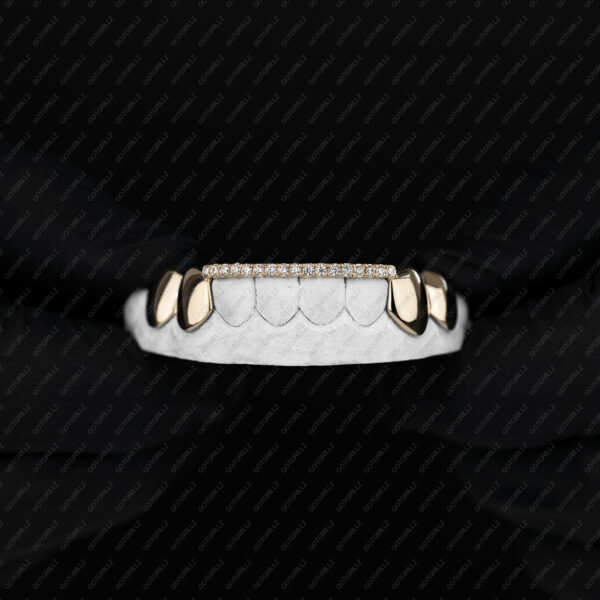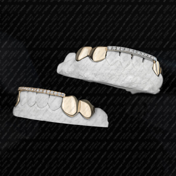 Got Grillz – Get your customized one of a kind Gold Diamond Top Bar Bottom Grillz now! This Grill is made with high-quality Silver, 10K Gold, or 14K Gold on the tooth to give you a super shine. Grillz can be made in many variations for your liking. Look at our other listings for more styles and designs!