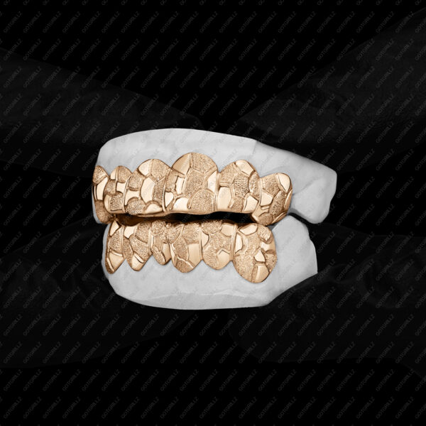 If you a looking for a different design or have any questions on custom specifications of Yellow Gold Nugget Cut Grillz, please contact us or give us a call 832-781-4528