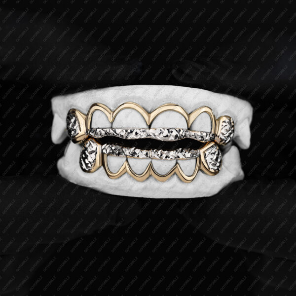 Yellow Gold White Gold Diamond Cut Punch Out K9s and Open Face Diamond Cut Tips Grillz